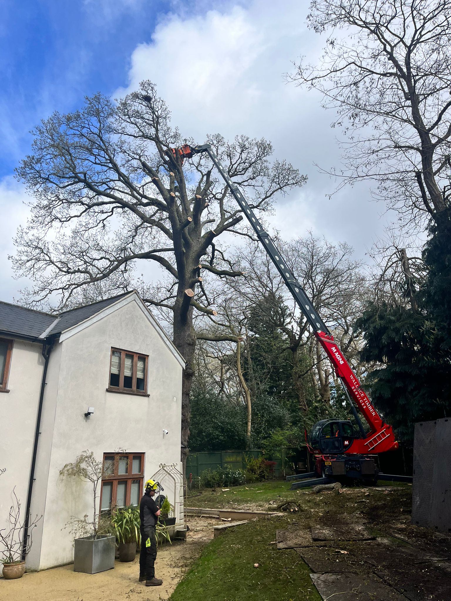 In Weybridge, Parish Environmental Services recently completed the removal of a large oak tree encroaching on a home’s foundation. While mature trees can add immense character to a property, this particular oak’s roots had begun to compromise the structural stability of the nearby house. Working with Al Wallace Timber Services, we undertook the complex task of removing this tree safely, efficiently, and with minimal disruption, using our expertise and advanced equipment, including the powerful magni roto telehandler with a westech woodcracker grapple saw.